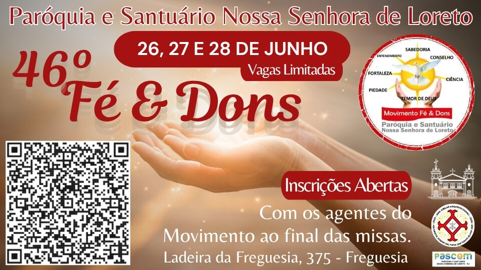 A Paróquia e Santuário Nossa Senhora de Loreto convida toda a comunidade para participar do 46º Encontro Fé & Dons, que será realizado nos dias 26, 27 e 28 de junho.