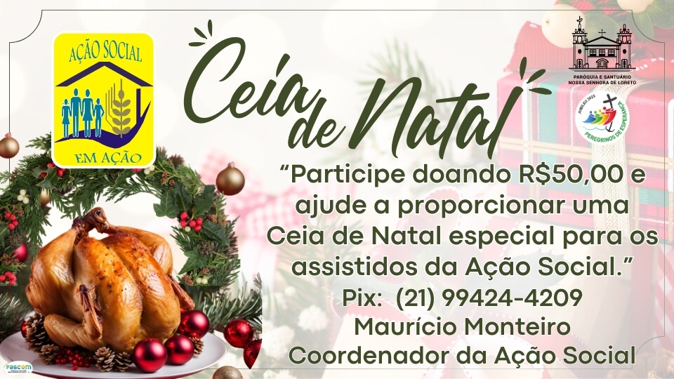 A Ação Social da Paróquia e Santuário Nossa Senhora de Loreto convida todos os fiéis a colaborarem com a Ceia de Natal Solidária, destinada aos assistidos pelos projetos sociais da paróquia.