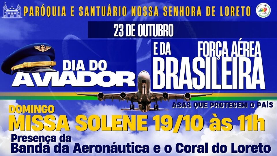 Em comemoração ao Dia do Aviador e da Força Aérea Brasileira, celebrado em 23 de outubro, a Paróquia e Santuário Nossa Senhora de Loreto — padroeira da aviação — convida todos para participar da Missa Solene no domingo, 19 de outubro, às 11h.