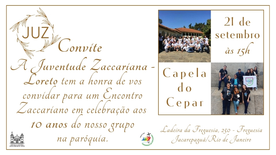 A Juventude Zaccariana – Loreto tem a alegria de convidar toda a comunidade para um Encontro Zaccariano, em comemoração aos 10 anos do nosso grupo na paróquia.